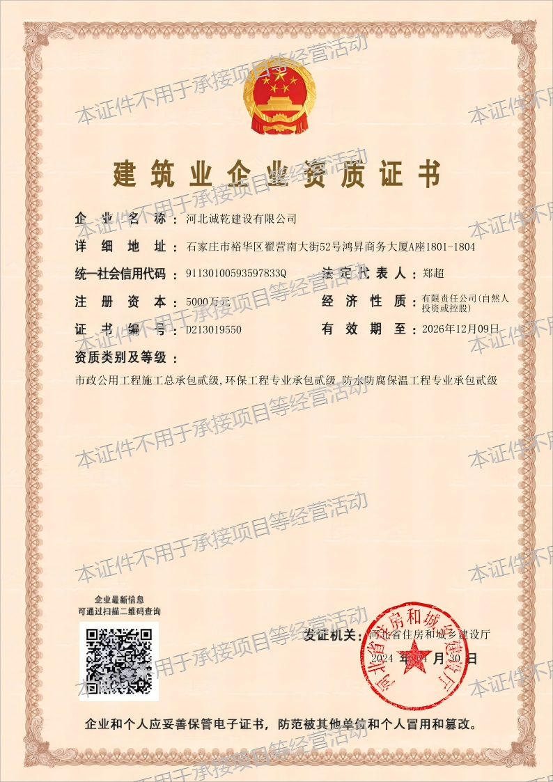 恭賀河北誠乾環保工程有限公司取得市政公用工程施工總承...